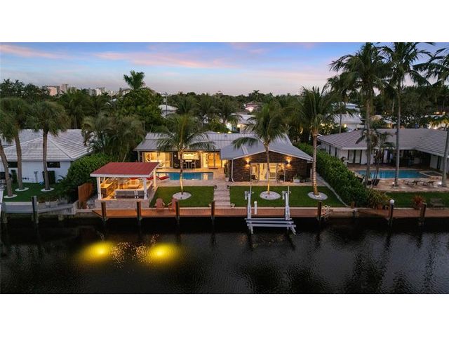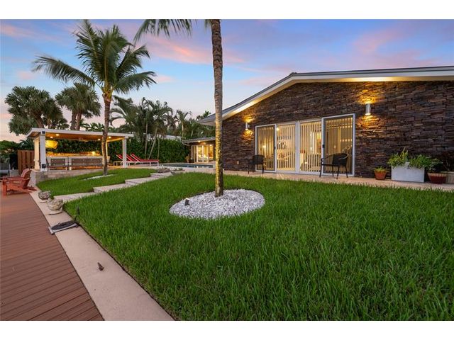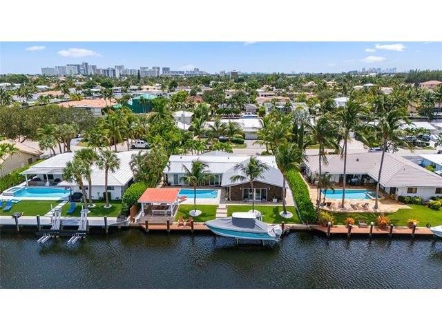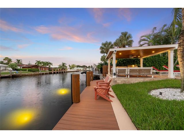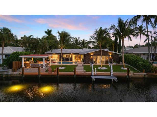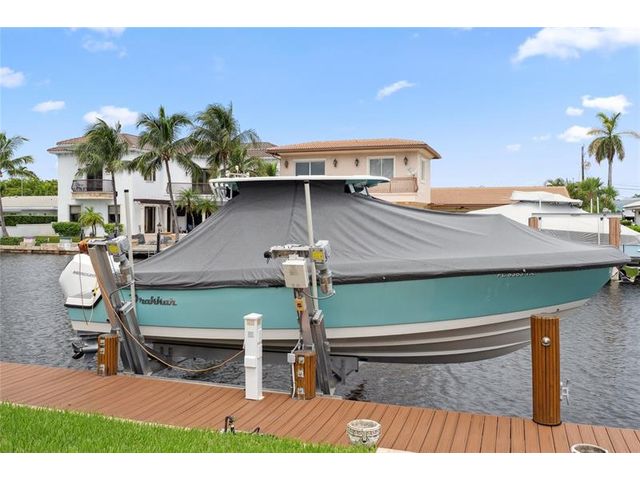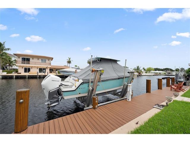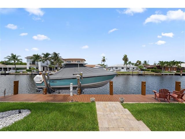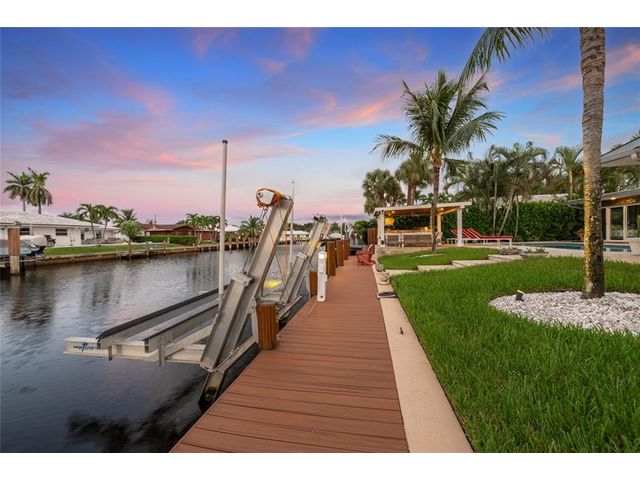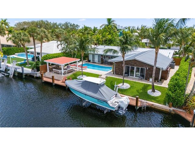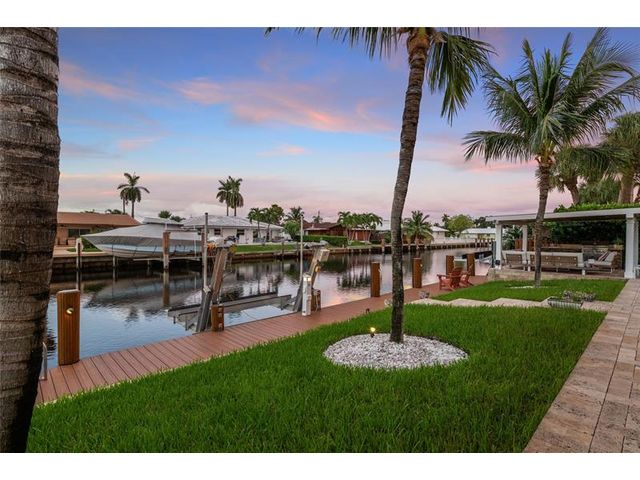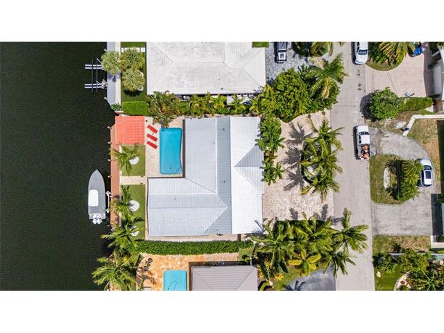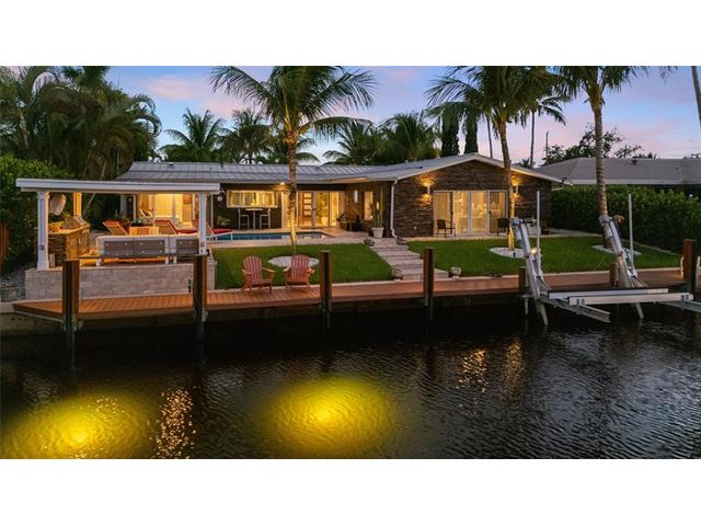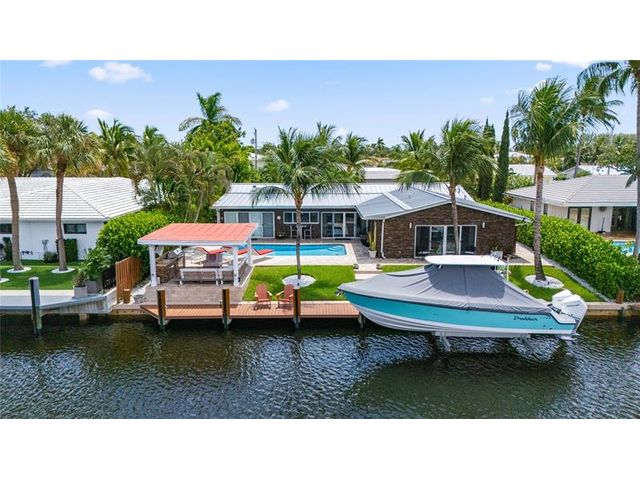 What a great waterfront home. Located on 80 feet of water frontage. This 4 bedroom and 3 bath home has been beautifully updated. Open kitchen with all new appliances. Hurricane impact windows and doors. Over sized 2 car hurricane impact garage door. Plus the garage is air conditioned. If you love to entertain, you will love the back yard with all the landscaped lighting. The pool has been updated with new heater/chiller. Great out side summer kitchen and gazebo. New 10,000 lbs boat lift and new Trex dock and under water lighting. The roof was replaced in 2017. Very quiet street and close to shopping, restaurants and the ocean. This is a must see.