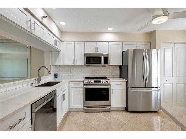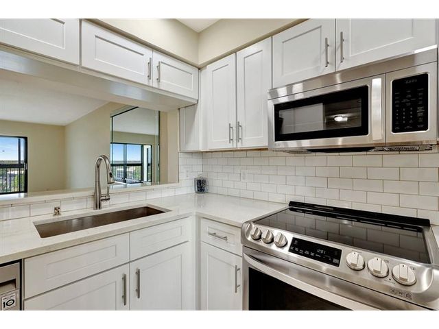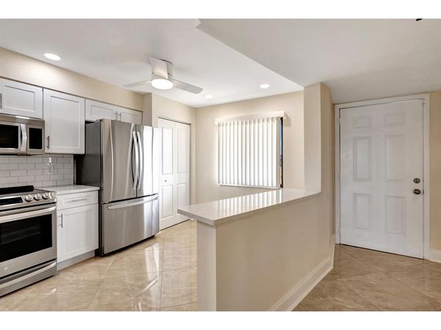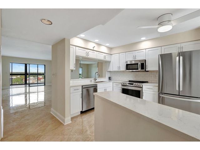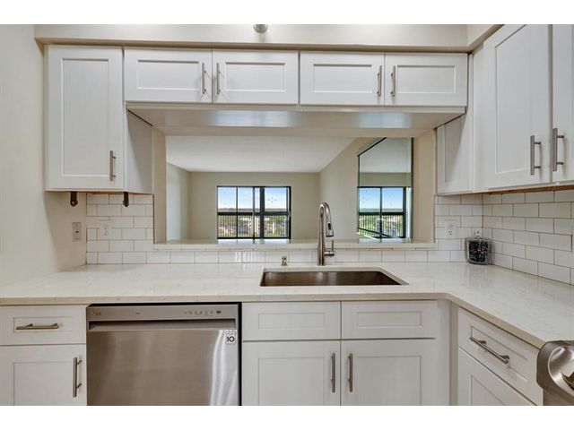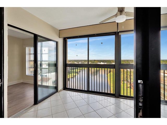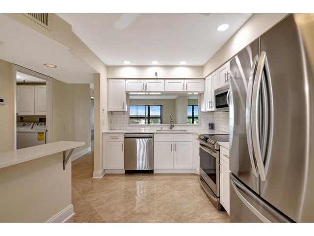 This penthouse home, remodeled in 2024 offers magnificent water views and a stylish design throughout. The kitchen features white cabinetry, white quartz countertops and stainless steel appliances. The bathrooms showcase a stunning combination of wood, white and gold accents. The bedrooms are enhanced by brand new tile flooring, while neutral tile floors flow seamlessly through the living areas. The oversized master bedroom boasts a separate sitting area with breath taking water views. The enclosed patio overlooks the serene water, perfect for relaxation. NEW IMPACT WINDOWS. Renovated clubhouse, indoor & outdoor pool, sauna, whirlpool, tennis, pickle-ball, billiards, theater, shows, clubs, library, walking trails, a courtesy bus. Minutes to dining, shopping, downtown Delray and the beach.