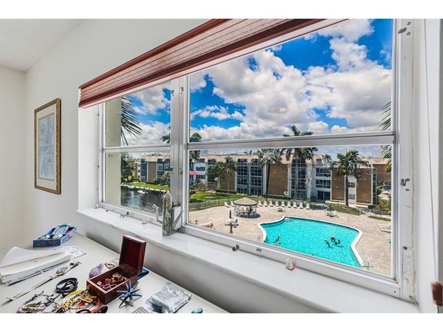 Overlooking the Middle River with views of downtown Ft Lauderdale and the pool is this oversized corner fourth floor condo with windows on three sides offering an abundance of natural light. New ceramic flooring throughout, new baseboards, stainless steel appliances in kitchen (2022), AC (2022), Hot water heater (2022). Screened in balcony off of the living room and primary bedroom with sweeping views of the river and slyline provide the perfect respite for your morning cup of jo. Convenient location close to the beach, downtown, and Wilton Manors. The community offers an array of recreational facilities including a waterside pool, tennis courts, ,fitness center and shuffleboard. 40 year certification complete.
