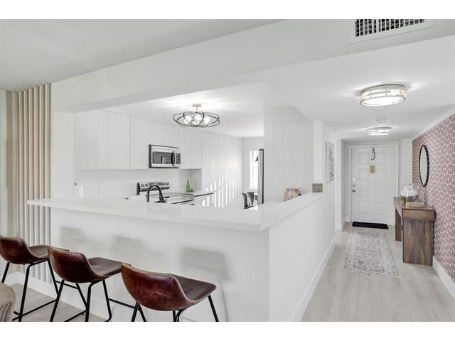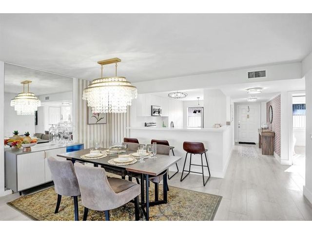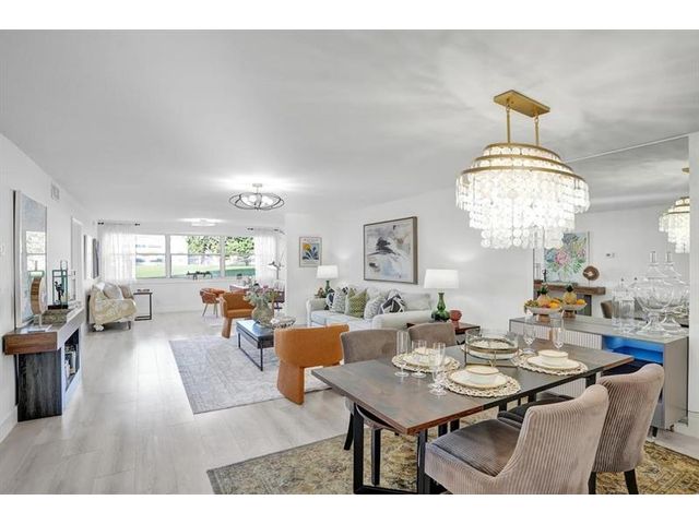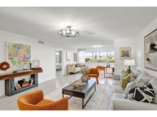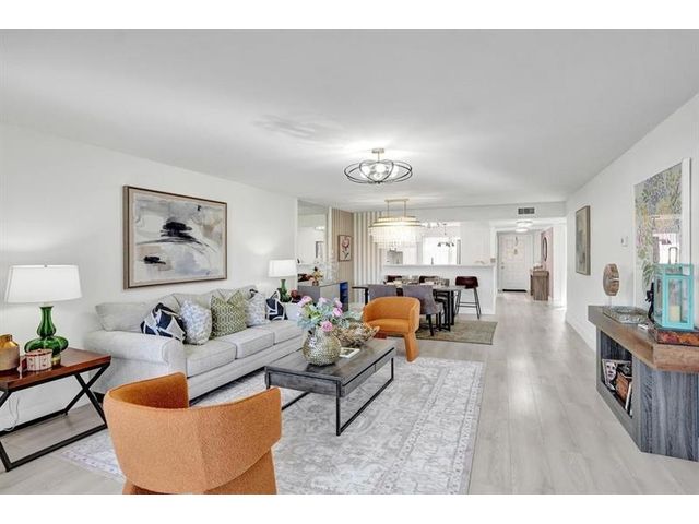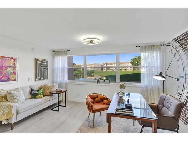 Stunning fully remodeled 1,370 SF first-floor residence blending luxury, comfort & timeless style. This split floor plan features 2 bedrooms + versatile office/den & 2 baths, open-concept layout w/ tons of natural light, serene lake & golf course views. The gourmet kitchen impresses w/ brand-new stainless steel appliances, quartz countertops, elegant cabinetry & designer finishes. Every detail was meticulously curated; new washer/dryer, water heater, upgraded electrical & hand-painted accent walls. Offered fully furnished or unfurnished, w/ parking right at your front door. Spacious laundry/utility rm w/ storage adds convenience. Vibrant 55+ community (one resident must be 55+,others 16+) offers golf, tennis, pools, clubhouse, live entertainment, theater, shuttle service & strong reserves.
