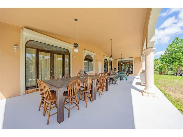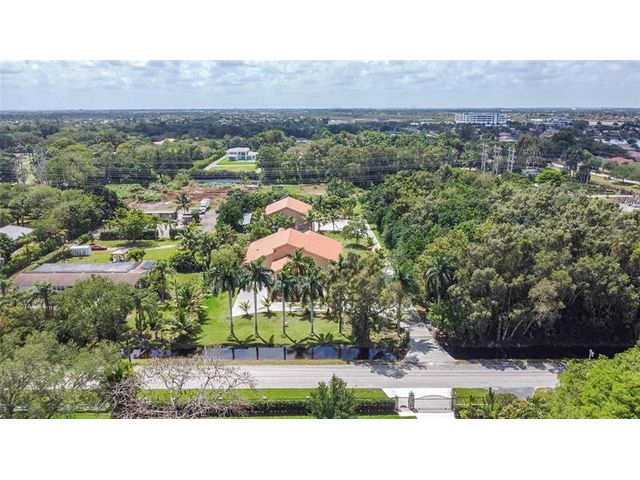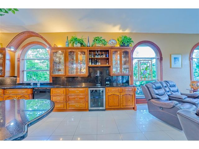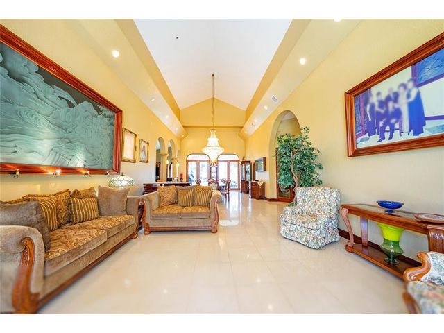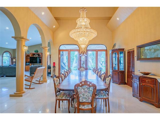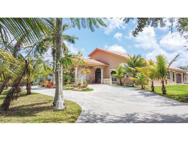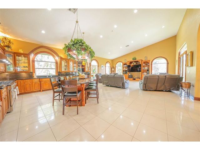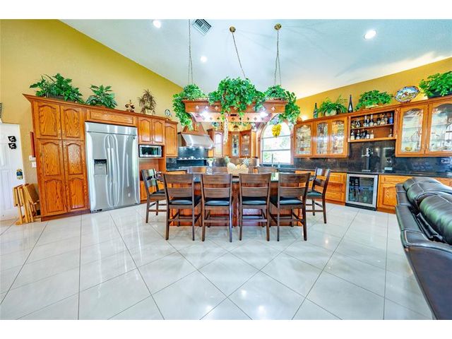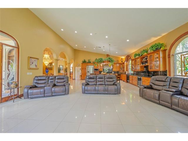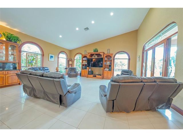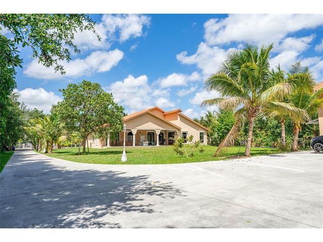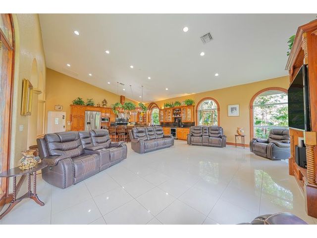 In the desirable community of Southwest Ranches, this custom Spanish-style estate sits on 2.35 acres and was built to last with reinforced concrete and timeless craftsmanship. The 3,400+ sq ft main home features 3 beds, 3 baths, an office, and vaulted ceilings up to 24 ft. The chef’s kitchen showcases oak cabinetry, black granite, a 48” gas range, oversized refrigerator, and a 10-seat island perfect for entertaining. The dining area easily fits a 14-seat table with room to spare. Enjoy a 51-ft covered lanai, full-house diesel generator, dual HVAC systems, Electrical roll-on hurricane shutters, RV portico, city water, fruit trees, and room to add a pool. A 50x60 ft detached garage includes four 1/1 in-law suites. The house is being sold as-is.