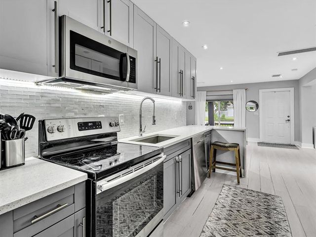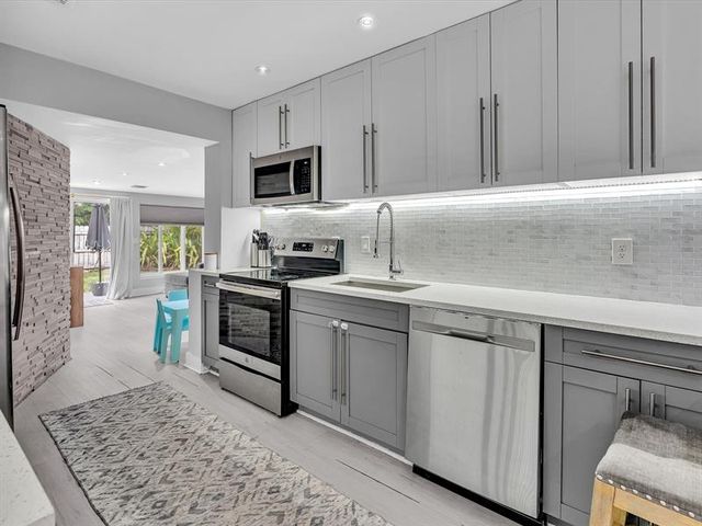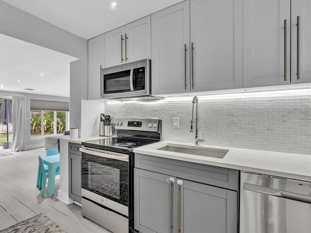 Beautifully updated 3-bed, 2-bath home in North Andrews Gardens! This modern residence features a spacious open layout with a bonus family room and custom stone accent walls. Enjoy peace of mind with a 2017 roof, full PVC piping (no cast iron, 2019), impact windows, tankless water heater (2019), A/C (2019), energy-efficient attic insulation installed this year(2025). The stylish kitchen and baths offer contemporary finishes, while the expansive master suite offers comfort and privacy. Laundry is a breeze with the new 2024 LG washer and dryer. Relax or entertain in the large back yard—perfect for outdoor living. Just over 3 miles to Lauderdale-by-the-Sea Beach, and only 10 minutes to downtown Fort Lauderdale. This home is very conveniently located to hop on I-95 in under a minute.