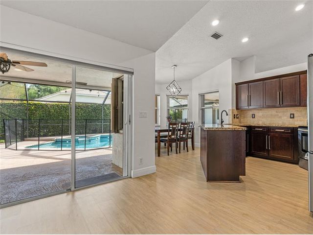 *CORPORATE RELOCATION* Welcome to this beautifully maintained single-story home in the highly sought-after community of Orchid Island. Situated on a prime corner lot, this 4-bedroom, 2.5-bath home offers a thoughtfully designed layout highlighted by vaulted ceilings that create an open, airy feel throughout the main living spaces. Step outside to an exceptional backyard retreat, featuring a sparkling pool and an incredible patio designed for entertaining, relaxing, and enjoying indoor-outdoor living year-round. Additional highlights include accordion shutters throughout, A/C unit less than 2 years old, beautifully renovated bathrooms, granite countertops in the kitchen with SS appliances.