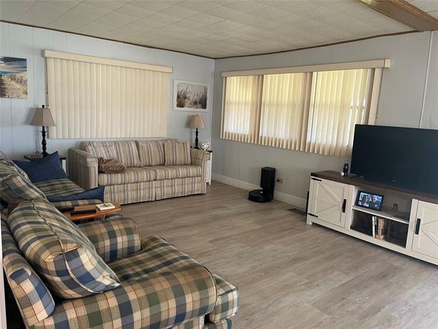 Enjoy beautiful serene views of the golf course and lake from the comfort of your Air Conditioned Florida Room or open the windows for a great breeze. New Beautiful neutral color water resistant Vinyl Faux Wood Flooring. Home is freshly painted inside and out. Landscape work is all done with a newly install sod, flowers and irrigation system. New extremely energy efficient Central A/C and Heat Pump System. Electric bills range from $46 - $135. Water-proof screened in room under carport with Double Doors opening which allows waterproof and secure storage of your golf cart and/or motorcycle/s and all your toys. You own the land. Quiet 55+ senior community with a social schedule with something for everyone. Includes 3 club houses and pools. Make this your forever home now. Must see.